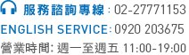 服務咨詢專線:02-27771153 English Serivce:0920203675 營業時間:週一至週五 11:00-19:00